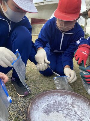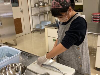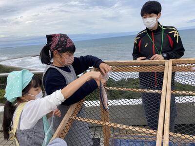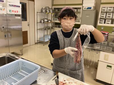 お昼をお腹いっぱい食べた後は、干物作りをしました。魚を開いて塩水に浸し、干して水分を飛ばすことで旨味を凝縮させます。魚を開くという、なかなかできない経験をすることができました。