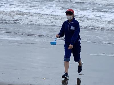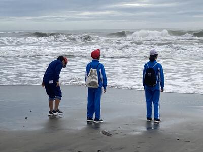 臨海自然教室2日目は、ラジオ体操から始まりました。朝食をしっかり摂った後は、海岸散歩。砂浜活動のウォーミングアップはバッチリです。