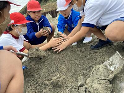 海水汲みリレーや、造形活動、みんなで協力して活動できました。