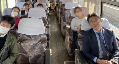 集合場所の鶴岡八幡宮を見学した後、バスに乗り、東京へ向かっています。