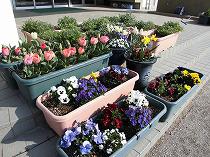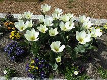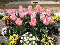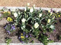 花壇のチューリップが背を伸ばし、色とりどりに咲き始めました。