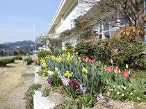 ご覧のように、満開のこぶしやチュウーリップ、桜が子どもたちの登校を待っています。