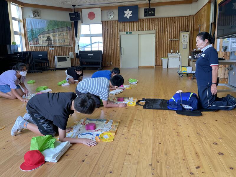 5・6年の児童は、真剣なまなざしで講師の方の説明を聞き、一次救命処置について学習しました。