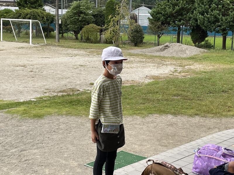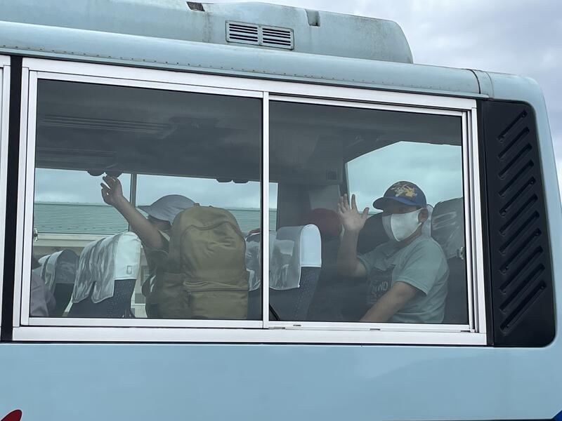 先ほど出発式を行い、スクールバスで出発しました。