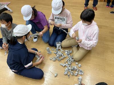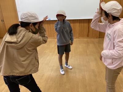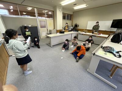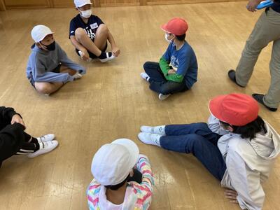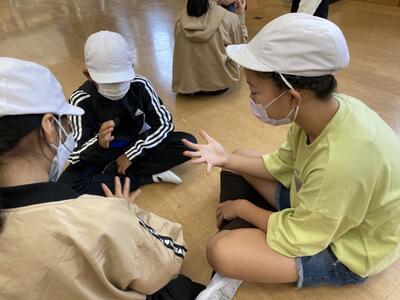 まずはじめに、他の小学校の友達と交流を深めるために、仲間作りゲームを行いました。