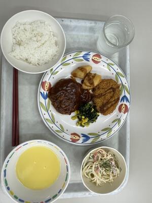 献立は、ごはん、煮込みハンバーグ、ポテトフライ、コロッケ、ほうれん草とコーンのバター炒め、スパゲティサラダ、スープです。