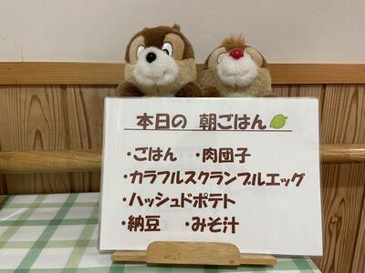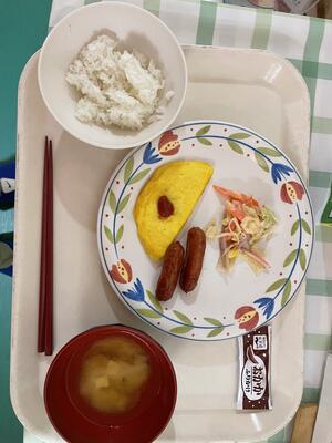 今朝はみんな元気に目覚め、朝食です。朝食の献立は、ごはん、ウインナーソテー、オムレツ、ハムとキャベツのサラダ、ふりかけ、みそ汁です。