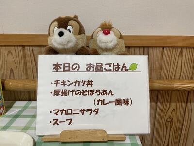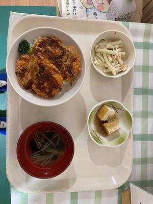 昼食の献立は、チキンカツ丼、厚揚げのそぼろあん(カレー風味)、マカロニサラダ、スープです。