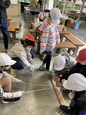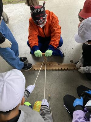 紐を引く人、棒や板を押さえる人、コンビネーションが大切です。