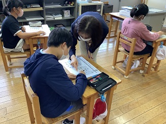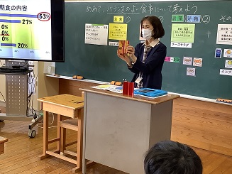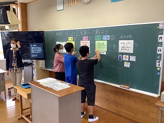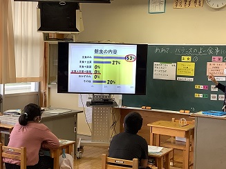 10月6日(木)に栄養士の松島先生から「バランスの良い食事」について5・6年生児童に指導していただきました。一人一人給食の献立をし、主食・副菜をバランス良く組み合わせることが出来たか確認しました。