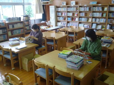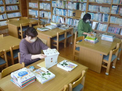 図書支援員の先生だけでなく、保護者のボランティアも募集し、作業を行っていただいています。