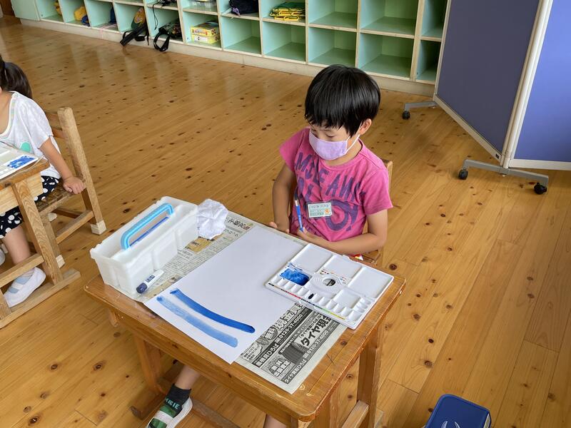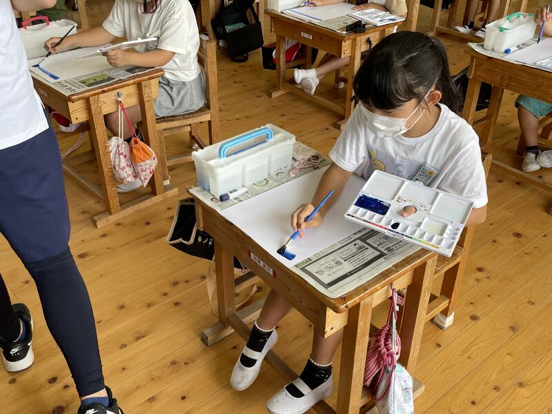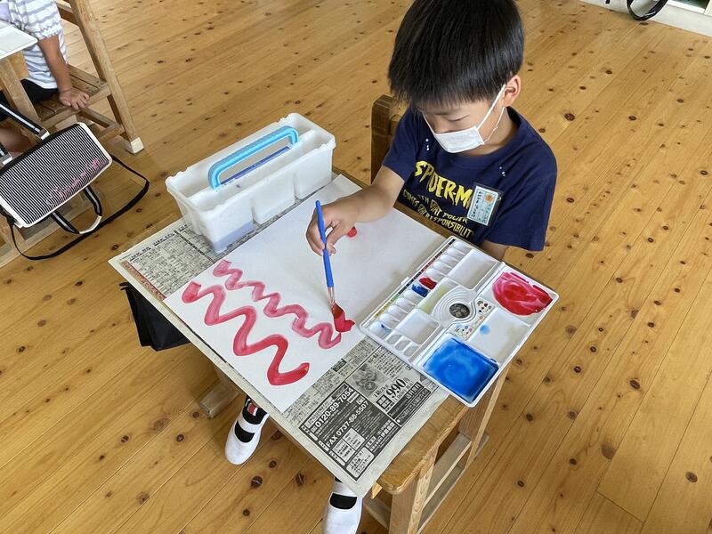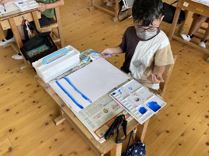 1・2年生が、図工の授業で絵の具やパレット・筆洗いの使い方を確認し、色々な線を描きました。