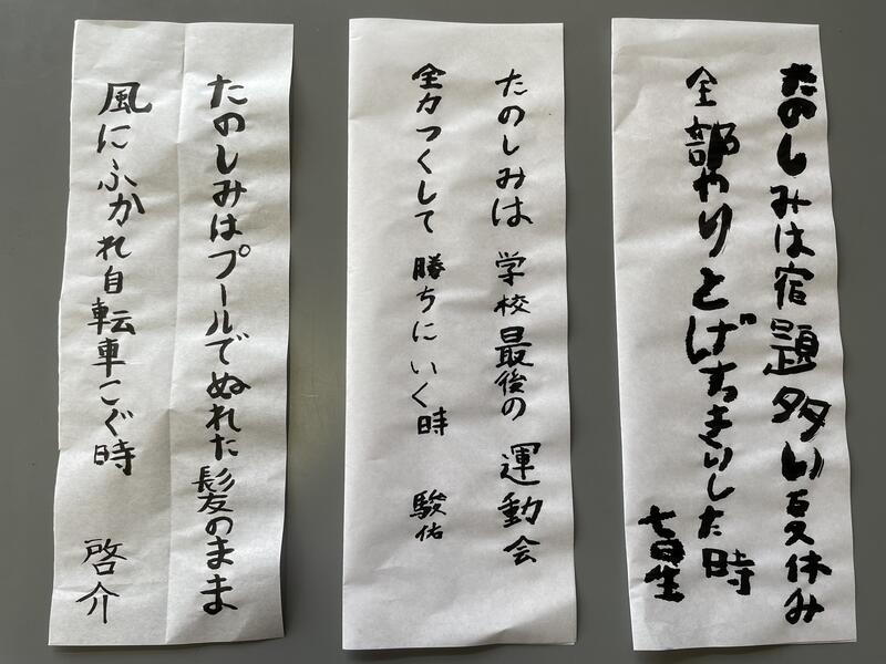 一人一人が自分の思いを短歌に表し、毛筆で書きました。