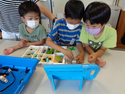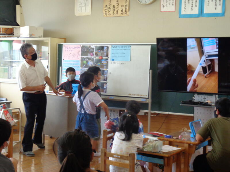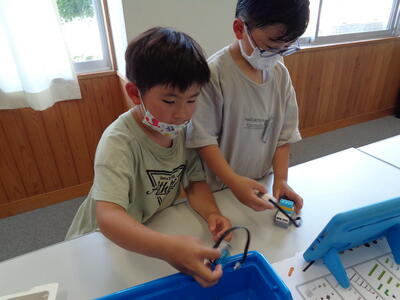 今日は、1・2年生が、ブロックを使ったプログラミング学習を行いました。1・2年生でペアになり、まずは、ブロックで扇風機の組み立てです。次に、タブレットにつなげ「回る」「光る」「止まる」「続ける」「逆に回る」などの指令を出します。指令どおりに動く扇風機に、みんな大興奮。最後に、それぞれのペアが出した指令の発表会をしました。いろいろな指令の出し方があって、感心したり、クスッとしたり。楽しくプログラミングが学べました。