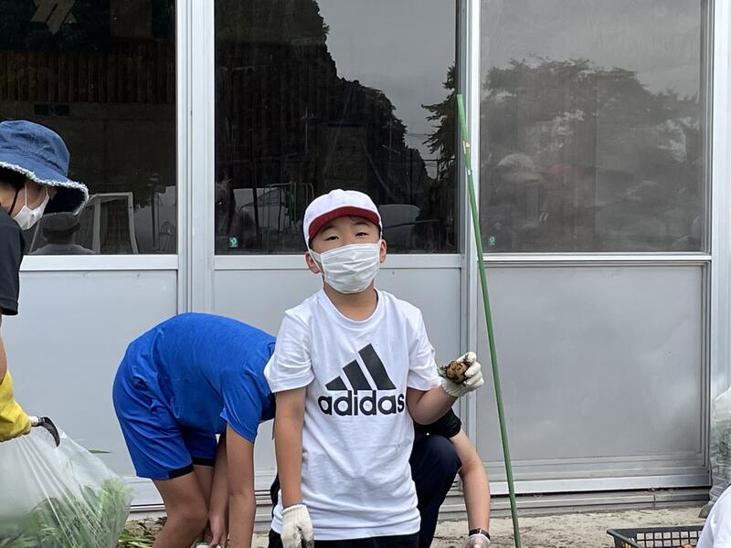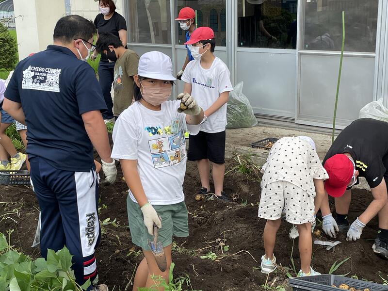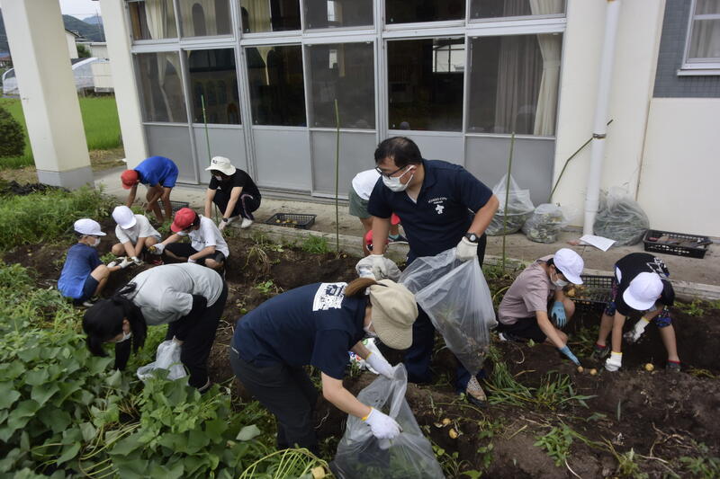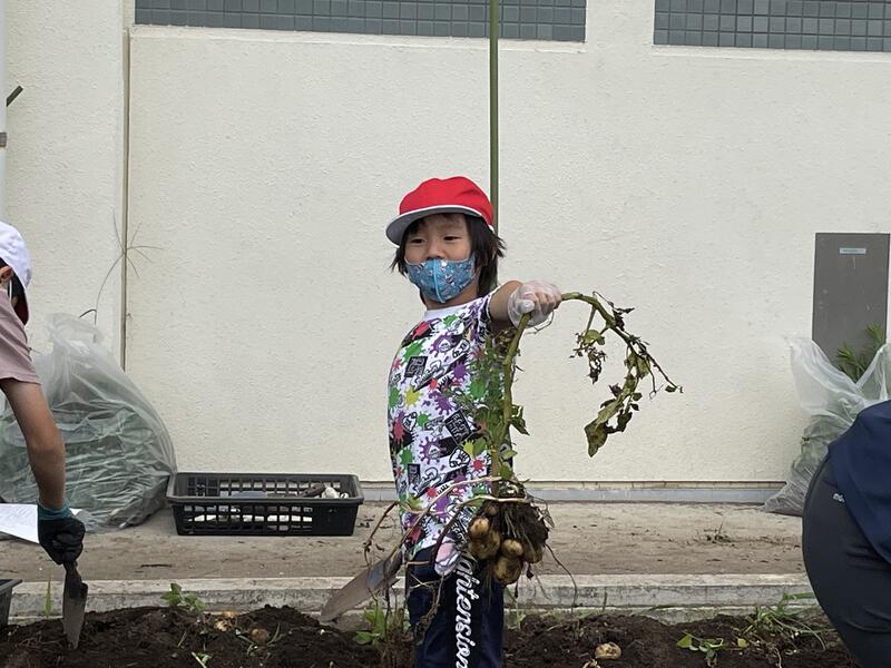 4月になかよし班(縦割り班活動)で植えたジャガイモの収穫を行いました。
