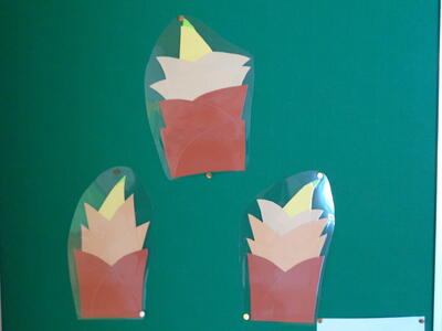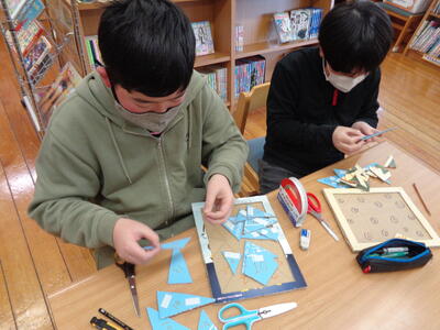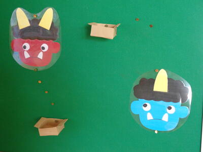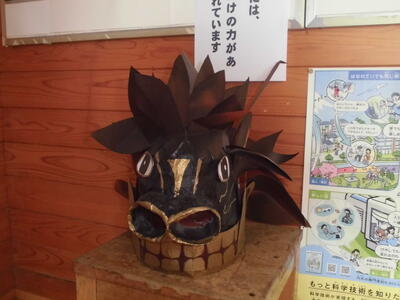 写真は、昨年の3・4年生が、小松神社について調べた時に作った紙製の獅子頭です。疫病よけのお守りとして昇降口に飾りました。