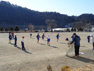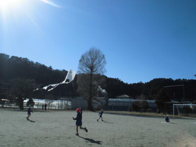 2時間目、校庭から子供たちの歓声が聞こえてきたので見てみると、1・2年生がたこ揚げをしていました。