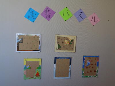 図書委員会主催、今年度最後の「図書室に足を運んでもらおうイベント」は、委員お手製の「読書パズル」!本を借りると、パズルのピースが1つもらえます。ピースをはめ込む時は、数字の色をよく見てくださいね。