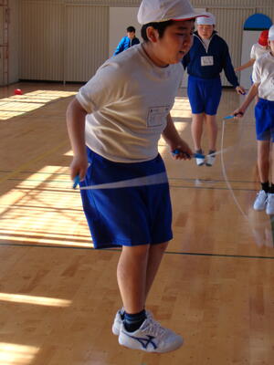 1・2年生のチャレンジ跳びは「後ろ連続跳び」「前あや跳び」「前二重跳び」から、5・6年生は「二重跳び」「前あや二重跳び」からの選択です。持久跳びは1年生は1分、2年生は2分、、、というように自分の学年分の時間を跳ぶことを目指します。