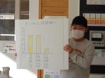 4年生は国語「調べて話そう 生活調査隊」の学習をしています。自分たちの生活について疑問に感じていることを調査し、みんなに伝える学習です。4年生が調査したのは「すいみん」。調査対象は3・4年生。アンケートをとりり、その結果から分かったことや感じたことをまとめました。協力してくれた3年生に伝えるだけでなく、職員室の先生方にも聞いていただきました。すいみんの大切さをみんなに伝えることができた4年生。調査からまとめ、発表まで、一人でよく頑張りました。