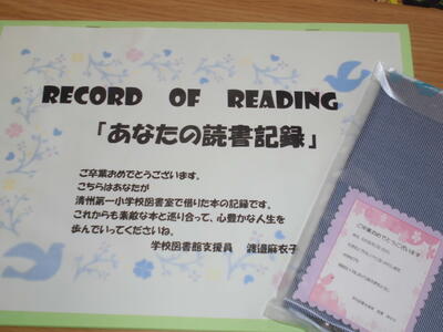 養護教諭からは、成長の記録のプレゼント。リボンの長さは6年間で伸びた身長と同じ長さになっています。図書支援員の先生からは、6年間の読書記録とブックカバーが贈られました。そして、KLVの方からは、素敵なしおりのプレゼント。
