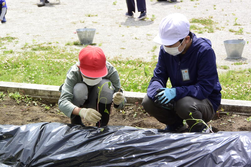 先月のジャガイモの種芋植えとは勝手が違い少し苦労していましたが、上級生の手伝いで植えることができました。