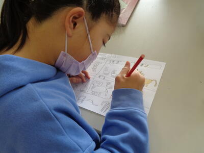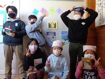 写真は、昨年の3・4年生が、小松神社について調べた時に作った紙製の獅子頭です。疫病よけのお守りとして昇降口に飾りました。