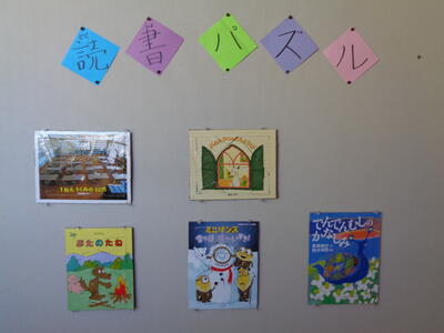 図書委員会主催、今年度最後の「図書室に足を運んでもらおうイベント」は、委員お手製の「読書パズル」!本を借りると、パズルのピースが1つもらえます。ピースをはめ込む時は、数字の色をよく見てくださいね。