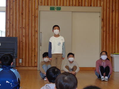 新入生を迎える言葉では、代表児童が本校のよいところ、「全校児童が仲がよい。」「勉強が楽しい。」「楽しい行事があるところ。」を紹介しました。
