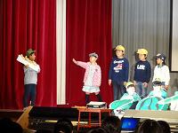 自分たちで育てた野菜になりきった2年生と、市場やスーパーで働く人になりきった3年生が、野菜や果物が家庭に届くまでの仕組みを発表しました。栄養士さんから学んだ食事のマナー『グー・チョキ・パー』の姿勢も紹介し、「育てた人や運んでくれる人の思いを大切にしっかり食べましょう」と、呼びかけました。