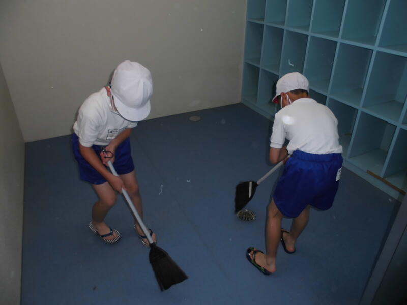 先日の奉仕作業で保護者の皆様にプール本体の清掃をしていただきましたので、今日は、プールサイドや更衣室などの清掃を行いました。