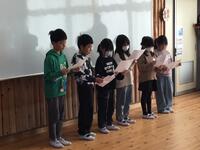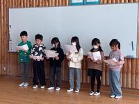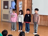 1年生は2〜6年生宛てに書いた手紙を発表しました。それぞれの学年に宛てた手紙は、心がこもっていて微笑ましいものでした。 2年生は「ありがとう」の詩を発表しました。家の人や友達に感謝の気持ちが届く内容でした。 3・4年生は手話で「赤鼻のトナカイ」と「手のひらを太陽に」を歌いながら紹介しました。 5・6年生は「思いやり」と「時間を守る」をテーマとした寸劇を行いました。