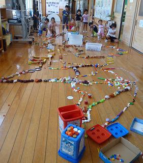 ペットボトルのふたや、つみき、ブロックなどなど、オープンスペースのものを総動員。