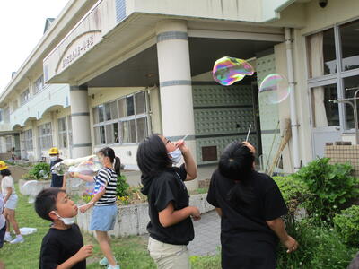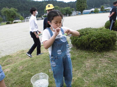 液ができたら、お楽しみのシャボン玉飛ばしタイム。毛糸を巻いたハンガーや、輪っかにしたモールでシャボン玉を作ります。大きいシャボン玉を作ったり、小さいシャボン玉を連続して作ったり、シャボン玉の中にシャボン玉を入れたりと、思い思いのシャボン玉を飛ばして大満足でした。