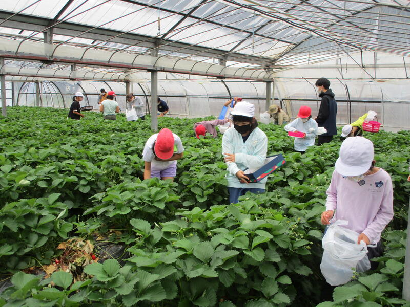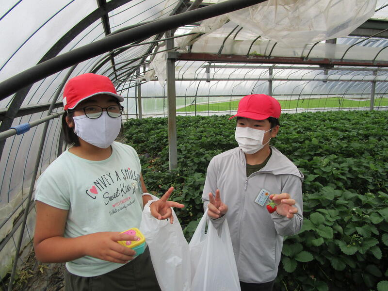 本校前にお住まいの大越様のご厚意により、全校児童がいちご摘み体験をさせていただきました。
