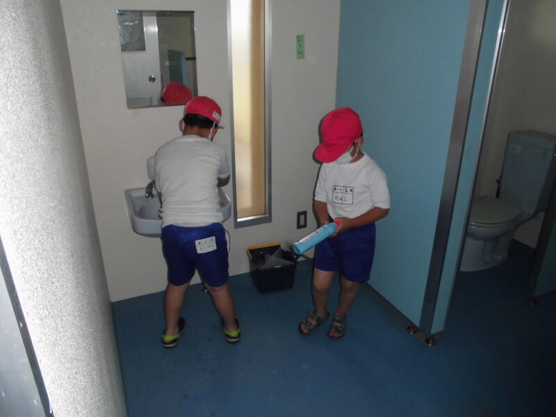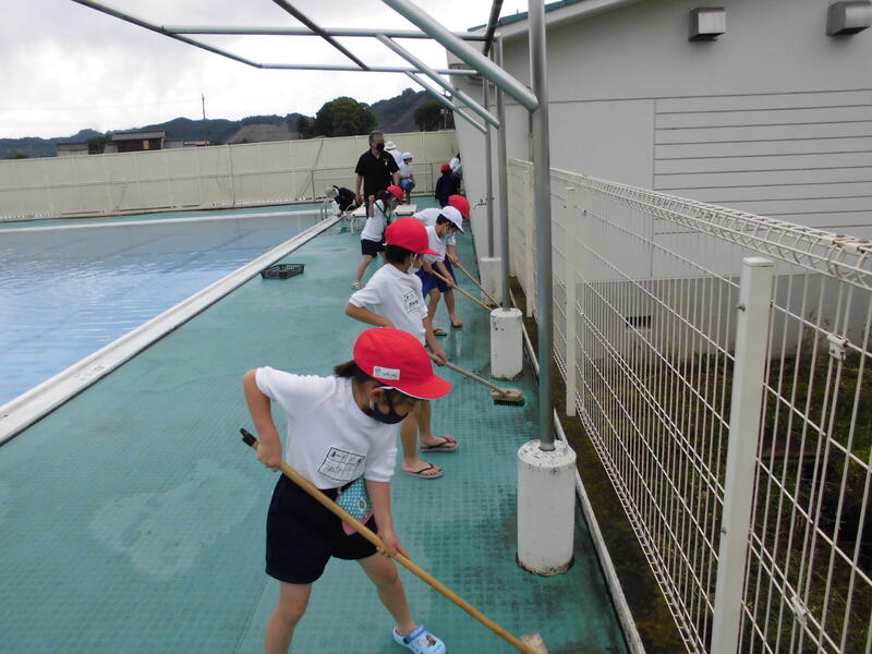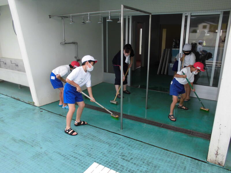 先日の奉仕作業で保護者の皆様にプール本体の清掃をしていただきましたので、今日は、プールサイドや更衣室などの清掃を行いました。
