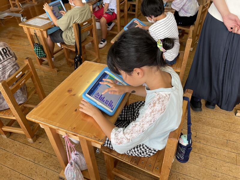 タブレットを使い、アニメーションにプログラムを加え、動画を作る学習です。