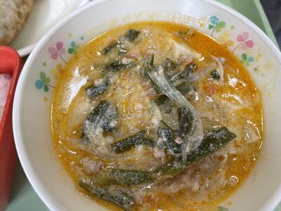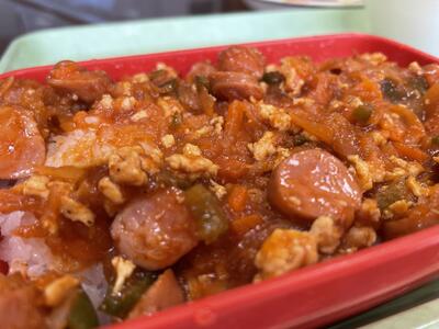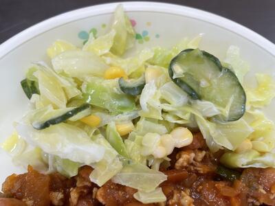 献立は、セルフジャンバラヤ(ごはん、ジャンバラヤの具)、牛乳、コールスロー、ヌードルスープです。