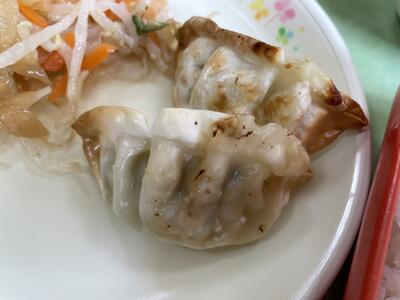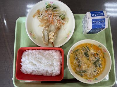 献立は、ごはん、牛乳、県産豚肉入り餃子、くらげ和え、豆乳坦々スープです。