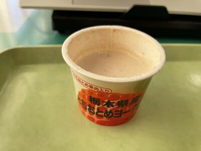 献立は、さつきの舞米粉パン、牛乳、はと麦ぞうすい、ハンバーグにらソースかけ、県産とちおとめヨーグルトです。