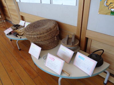3年生は社会科で「昔の道具を使っていた頃の暮らし」を学習しています。実は、清一小の資料室には昔の道具がひっそりと保管されているのです。そこで、みんなでそれらの道具をオープンスペースに出してみることにしました。すると、名前も使い方も分からない物がいっぱい!早速、名前や使い方を本で調べ、カードに書いて掲示しました。調べているうちに、「こんなものもあったんだ!」「昔はこんなだったんだよ!」と、思わず友達に紹介したくなってしまう道具も出てきたので、そちらは絵を描いて説明とともに掲示することにしました。するとオープンスペースが資料館のように!他の学年にも足を止めて、じっくり見て欲しいと思います。