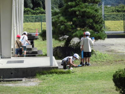 1・2年生が生活科の学習で秋の虫探しをしていました。花壇の中や芝生の上をじっと見ては、見つけた虫にタブレットをかざして写真をパチリ。気分はすっかり名カメラマンです。