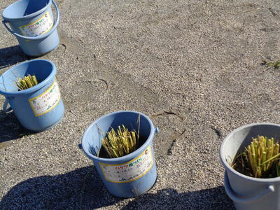 5・6年生が、4月22日にバケツにまいた種もみが、立派な稲に育ちました。