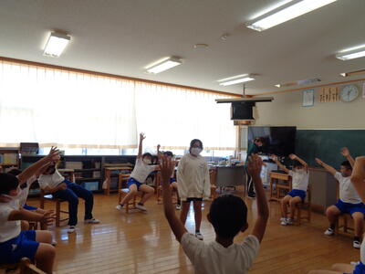 次は「ラッキーセブンじゃんけん」。1から5まで指を出し、足して7になったらひじタッチ。相手が何を出すか考えながらのジャンケンです。相手を思いやる気持ちにつながります。
