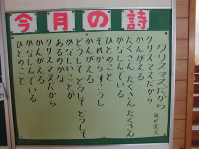 12月になり、KLVの方や図書支援の先生のおかげで、図書室が一気にクリスマスムードに!ALTの先生も、昇降口の詩のコーナーにアドベントカレンダーを飾って下さいました。クリスマスの飾りは、見ているだけでうきうきしますね。