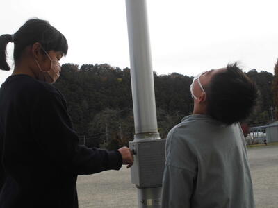 毎朝、6年生が中心となって行っている国旗の掲揚や昇降口掃除。今日は5年生と4年生が自主的に行っていました。