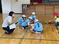給食の後は、講師をお招きしての親子レクリエーションを行い、親子で一緒に体を動かしながら楽しむことができました。