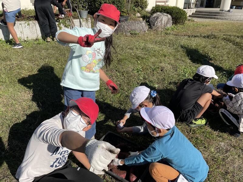 なかよし班(縦割り班)活動で、5月に植えたサツマイモの収穫を行いました。