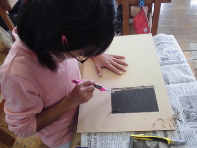 4年生の図工の単元は版画。初めて彫刻刀を使います。そこで川上澄生美術館の青木館長さんをお招きし、版画教室を開きました。彫刻刀の種類や、握り方など教えていただき、線彫りから練習です。力の加減がわからず悪戦苦闘していた子供たちですが、何度も練習するうちに長い線も彫れるようになってきました。最後は「王」の文字まで彫り上げるまでに!来週の版画教室も楽しみです。