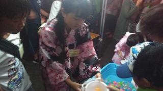 雨が降ったりやんだりの天候でしたが、「いらっしゃ~い!」「楽しいですよー!」とお客さんを呼び込み、笑顔で接客しました。みんなの元気なパワーに、盆踊りの最後、櫓からの振る舞いの頃には雨もすっかり上がっていました。